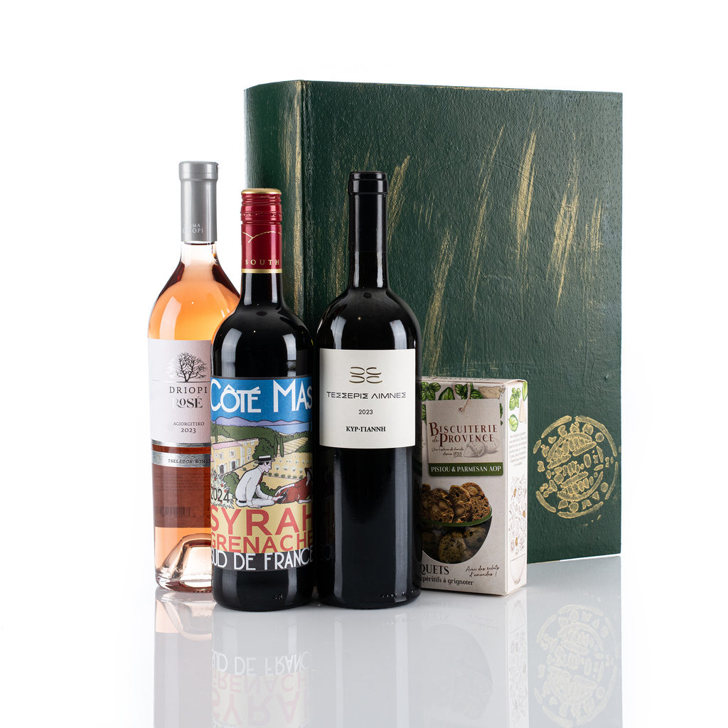 Συσκευασία ξύλινη 3 φιαλών (28Χ39Χ10) Κυρ-Γιάννη Τέσσερις Λίμνες λευκό Κτήμα Δρυόπη ροζέ Cote Mas rouge Intense D’oc I.G.P. Μπισκότα Provence 90g Διακόσμηση