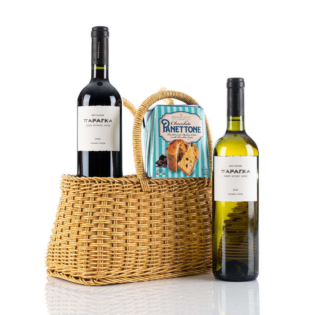 Καλάθι με χερούλια 2 φιαλών (30Χ15,5) 1 Κυρ-Γιάννη Παράγκα λευκό 1 Κυρ-Γιάννη Παράγκα ερυθρό Panettone 100g Italy Διακόσμηση