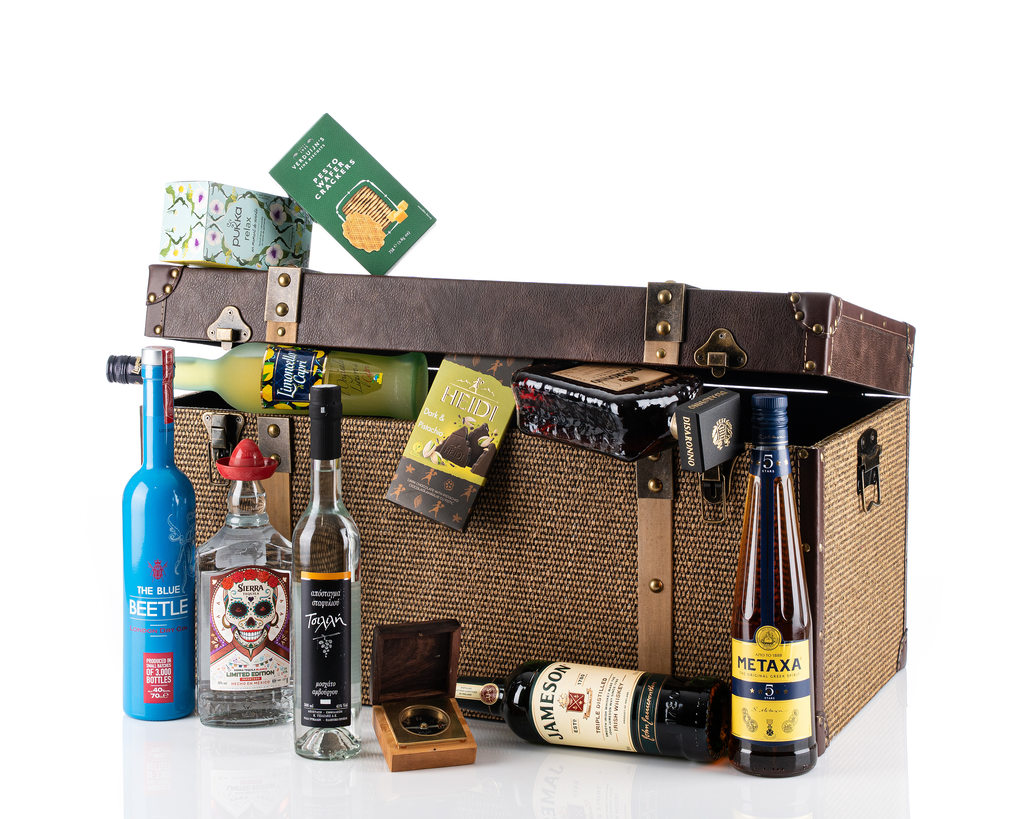 Ξύλινο μπαούλο με δερμάτινες λεπτομέρειες 8 φιαλών (70Χ36Χ36)